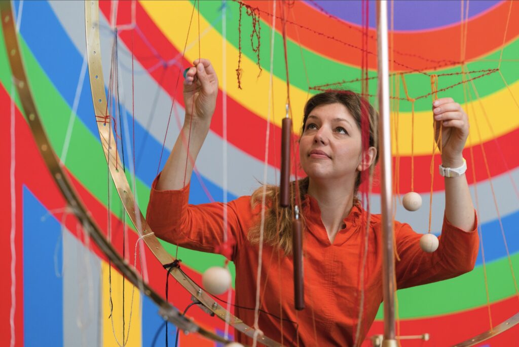 I make performative objects that range from experimental musical instruments to large-scale, communally played structures. Sci-fi engineering meets foraged plants like willow and water reed which have long been used for magic and music making. Metals, fibres and clays shimmer with sound when children and adults play them together.